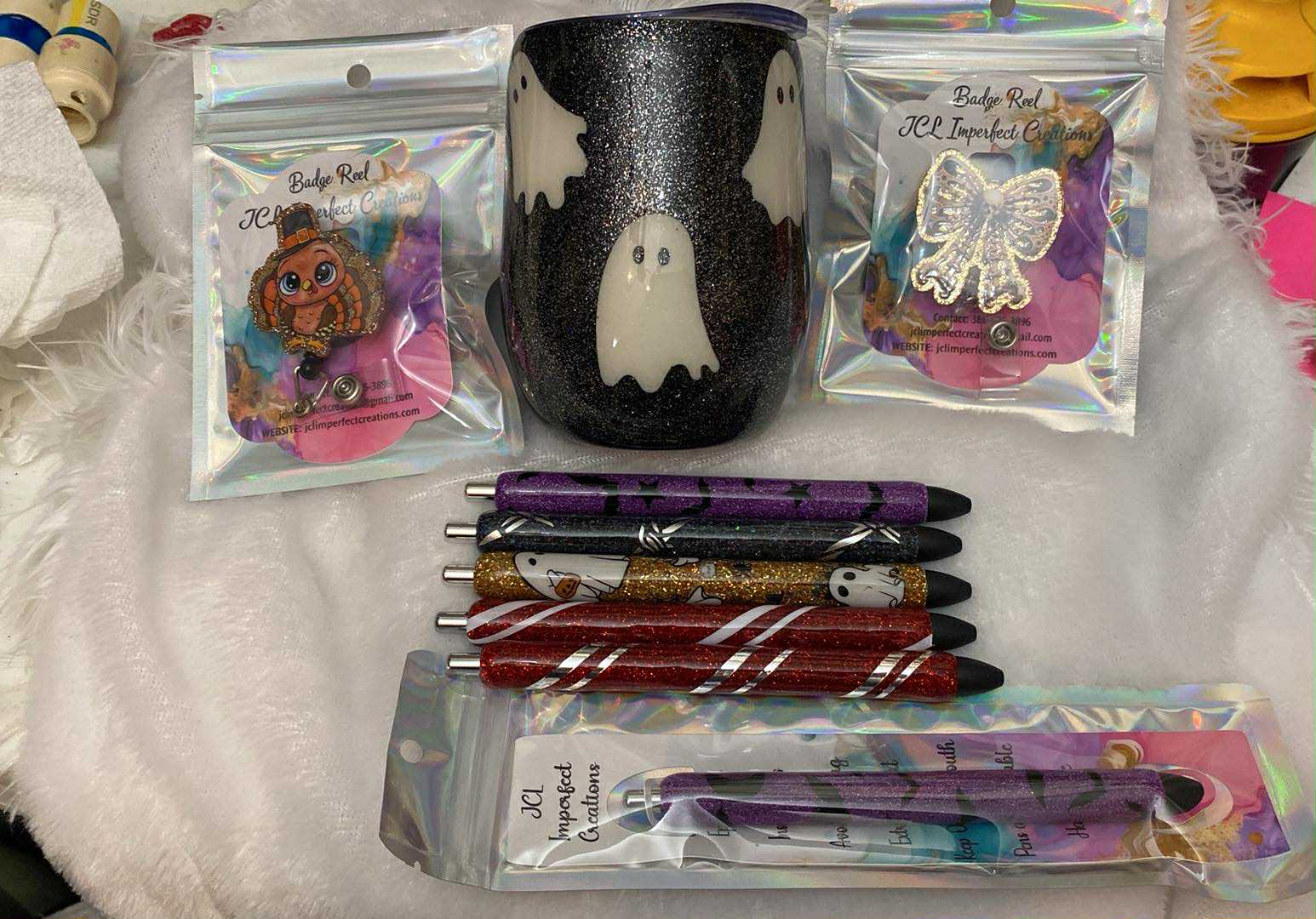 6-Pens(2-candy cane, 2-purple bats, 1-barbed wire 1- ghost) $10x6= $60